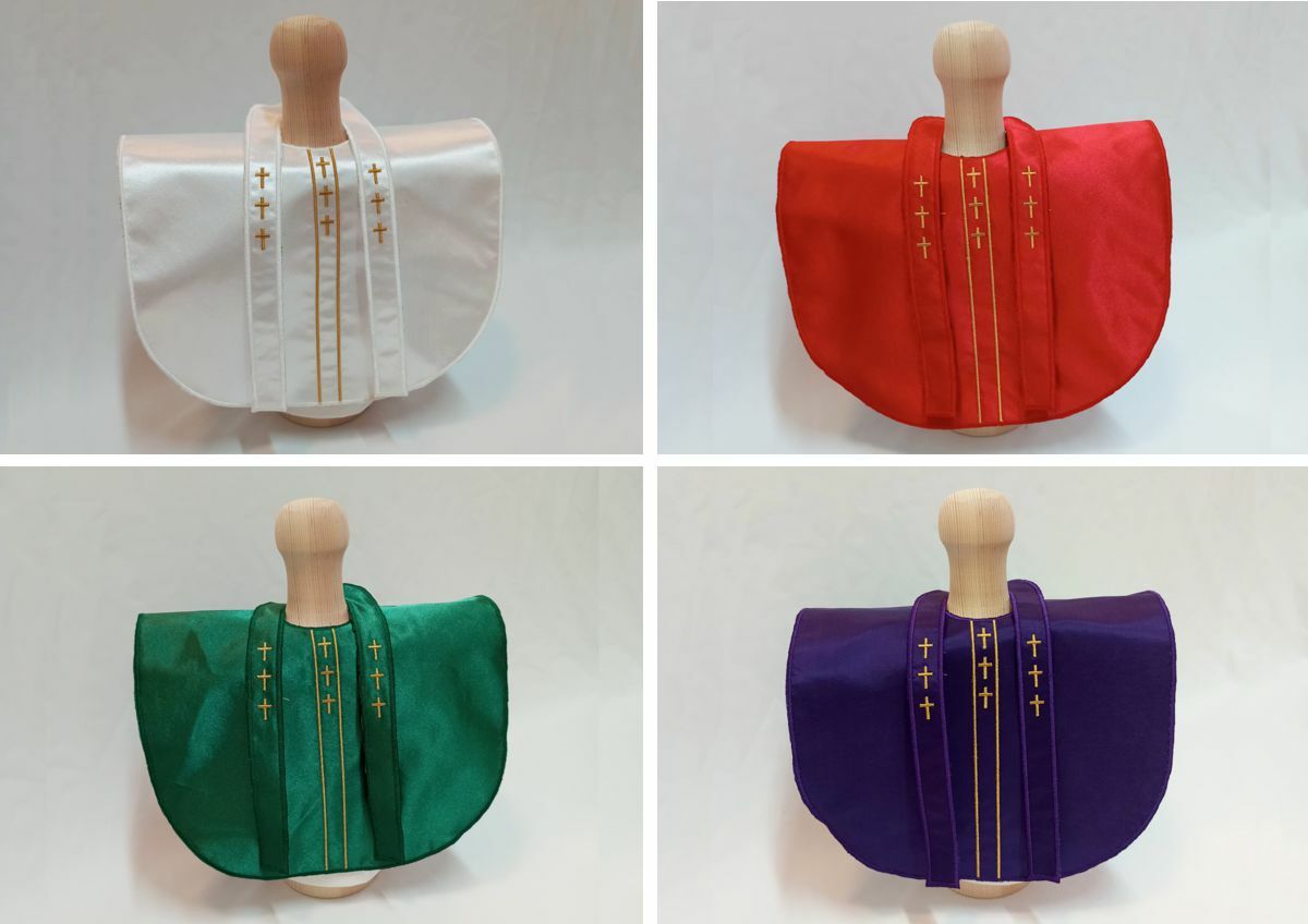 Sada čtyř ornátů v liturgických barvách pro dřevěnou figurku kněze vysokou 30 cm.