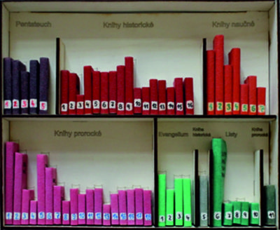nelepené je tedy varianta k dokončení - potištěné obálky v archu + nařezané dřevěné špalíky. Vaším úkolem bude rozstříhat arch obálek knih podle linky na jednotlivé obálky, nabarvit tři hrany knihy bílou barvou (listy knihy) a nalepit příslušnou obálku na příslušný špalíček. Vnitřek knihy je označen biblickou zkratkou (používáme značení Ekumenického překladu Bible). Pavlovy Listy jsou odlišné, mají volnou přední stranu a vlepenou zelenou podsádku s ručně psaným seznamem, ale to jistě znáte.