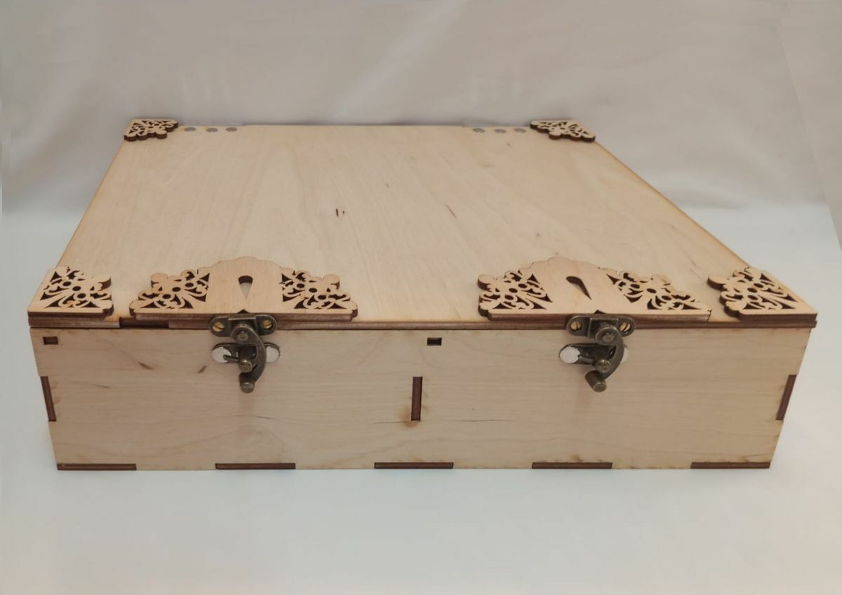 Skříňka z překližky se čtyřmi oddíly, každý na velikost sešitku do velikosti A6 (105 mm x 148 mm)