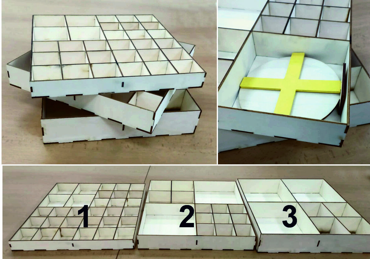Tři tácy s vnitřním členěním, každý je jinak vysoký (vnitřní výška táců je 3 cm, 4,8 cm, 6 cm).
