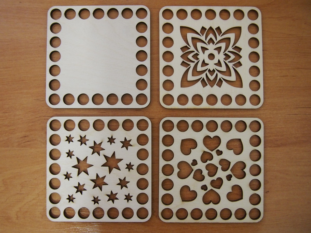 Vyřezáno laserem z překližky. Tloušťka materiálu je 3-4 mm.