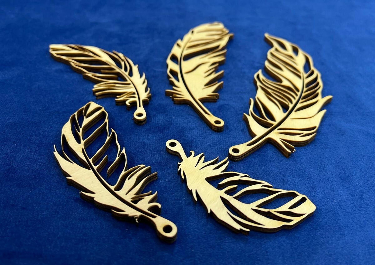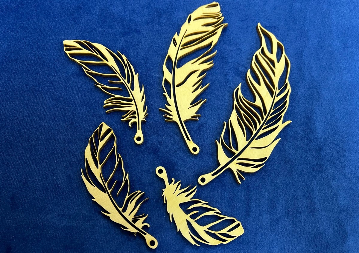 Sada pěti peříček ve velikostech od 7 do 13 cm. , dírka na zavěšení má průměr 2,5 mm