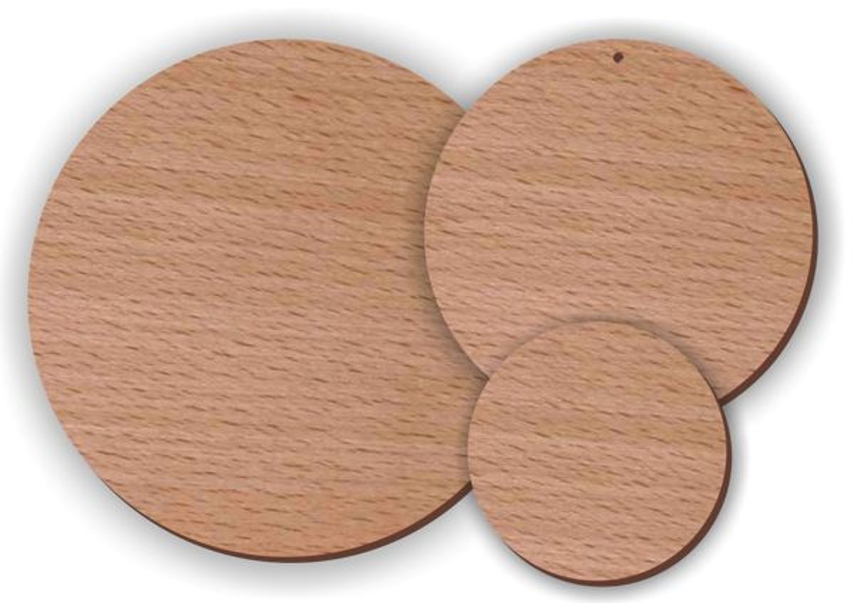 Vyřezáno laserem z topolové překližky (tloušťka materiálu je 3 mm), průměr dírky je 4 mm . Rozměr, který udáváme, je průměr kolečka.