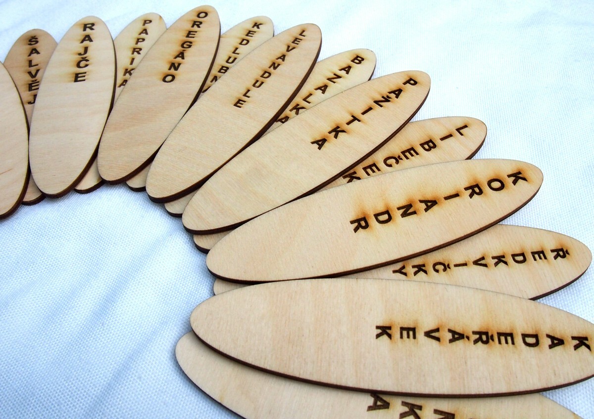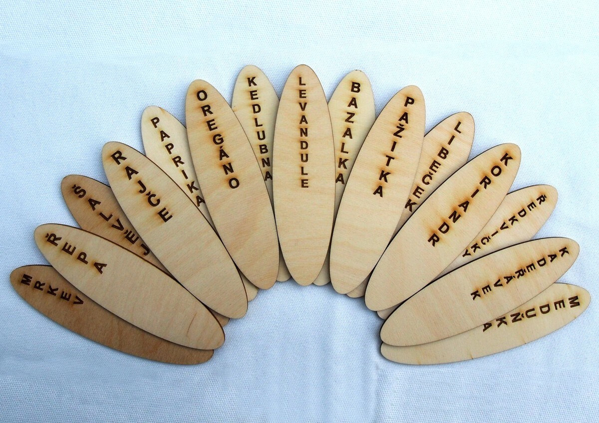 Zápichy do květináče vyřezané z dřevěné překližky.