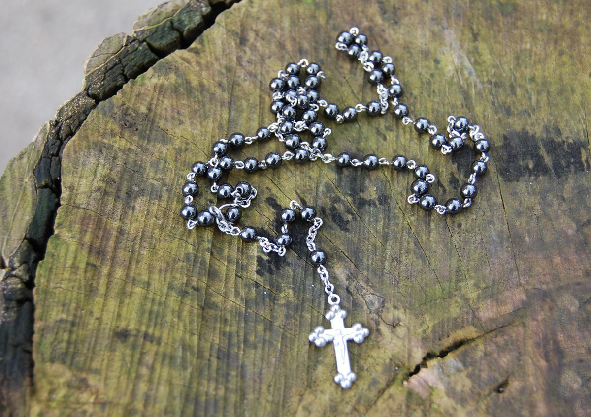 Růženec z hematitu a chirurgické oceli vyrobený v naší chráněné dílně.