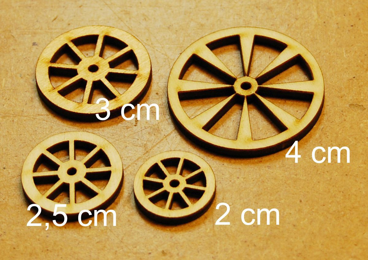 Vyřezané laserem z pevné bukové překližky silné 3 mm. Kolečka jsou určená pro další tvoření. Mají dírku na osičku o průměru 2 mm. Standardně vyrábíme kolečka o půměru 4 cm, 3 cm, 2,5 cm a 2 cm. Pořadovaný průměr prosím vyberte. Pokud potřebujete kolečka větší nebo jiná, napište nám.