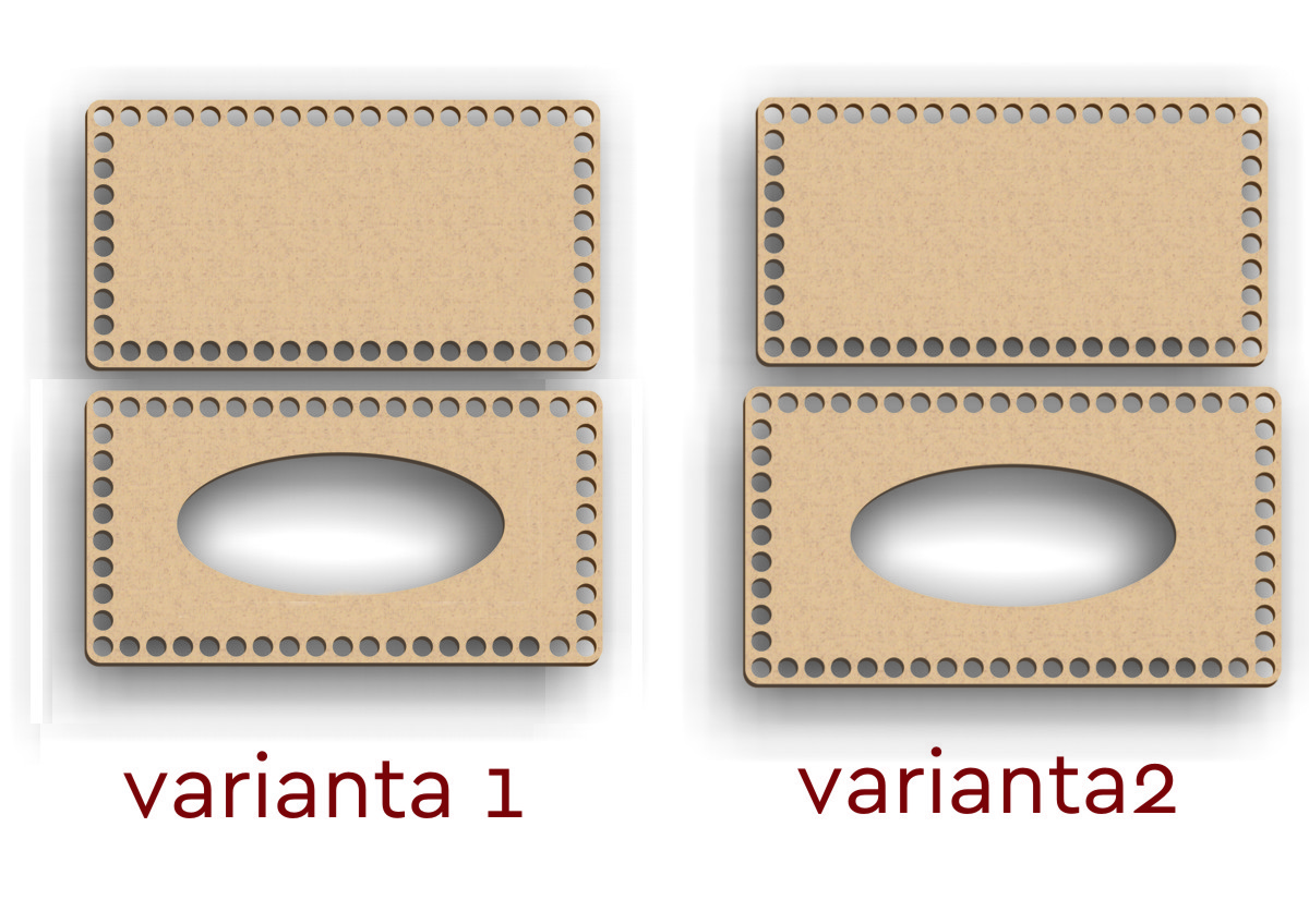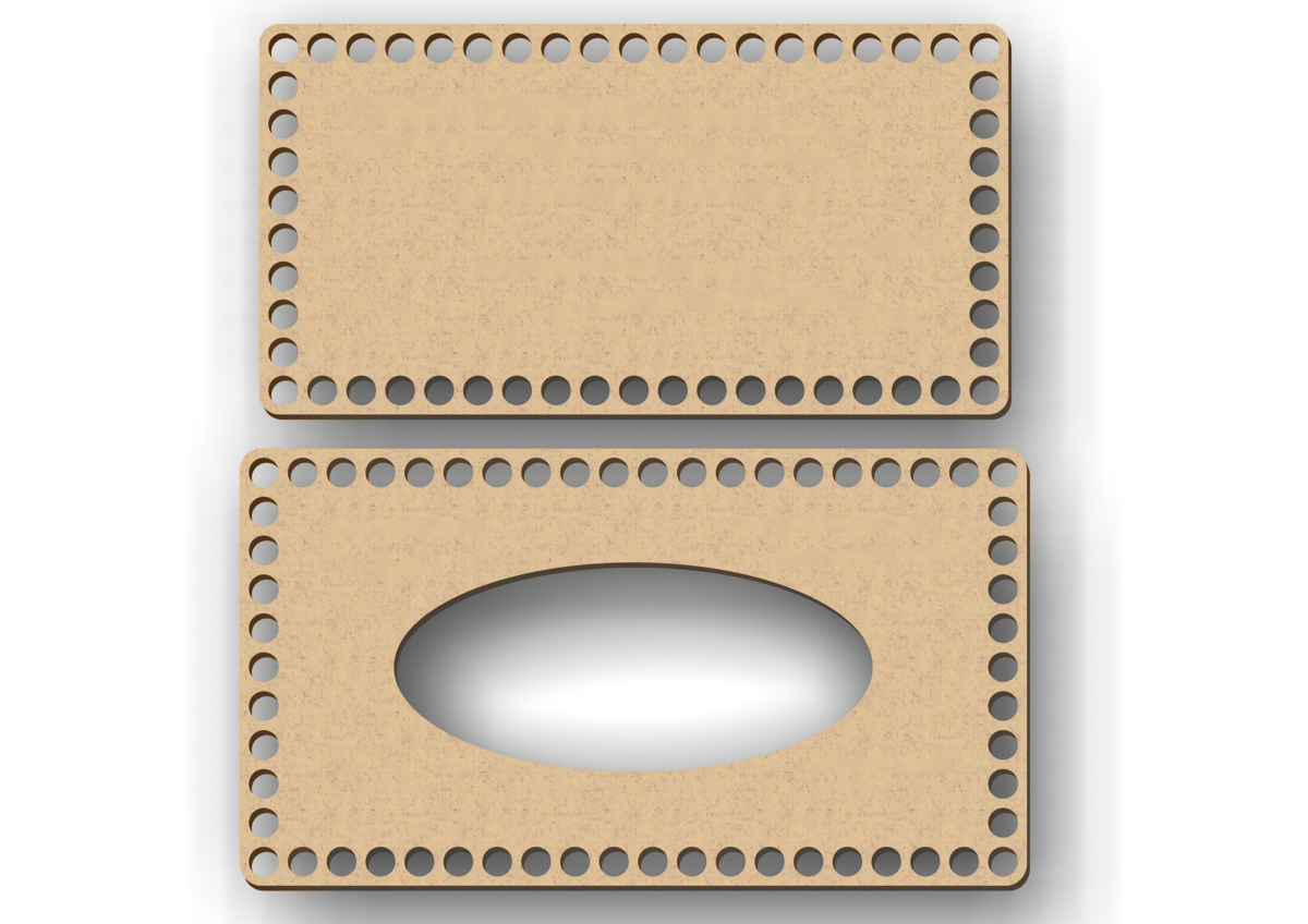 Sada - Dno a víko na háčkovanou krabičku na papírové kapesníky. Vyřezáno laserem z překližky (tloušťka materiálu je 3-4 mm), průměr dírky je 10 mm. Mezery mezi dírkami jsou 3 mm, takže středová vzdálenost dírek je 13 mm.