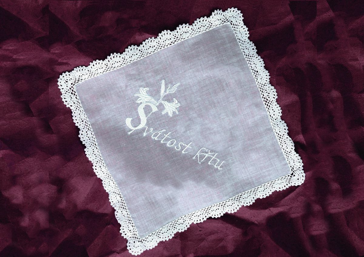 je čtvercového tvaru (cca 25 cm) vyšívané bílou lesklou viskózovo přízí na velmi jemném bílém bavlněném plátýnku a lemované paličkovanou krajkou širokou 2 cm.