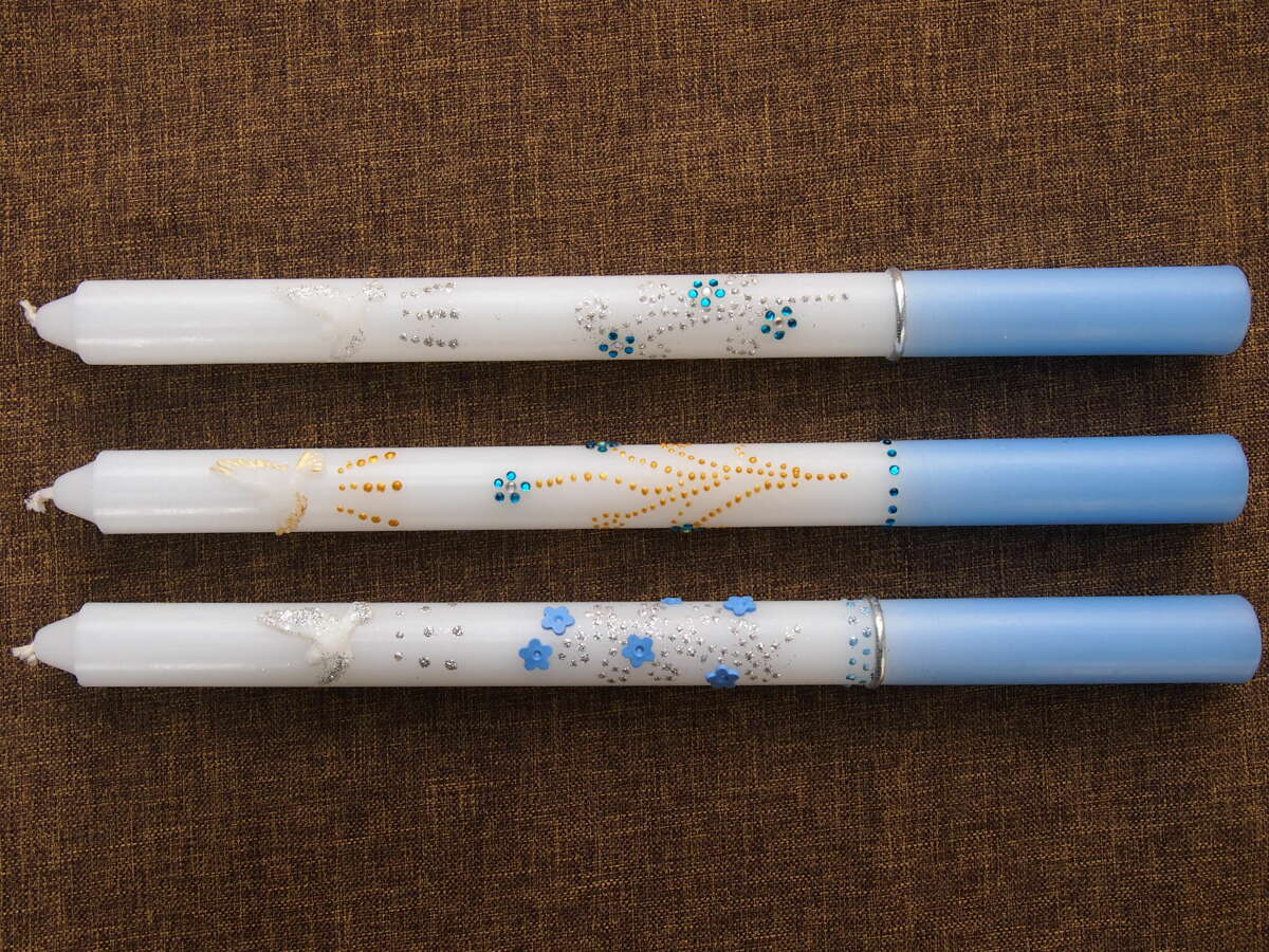 - Svíce s holubičkou a kytičkami, světlemodré zdobení