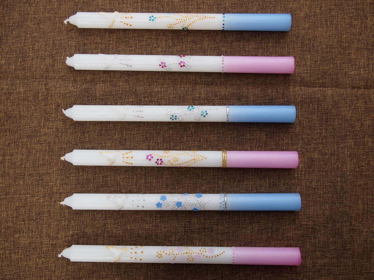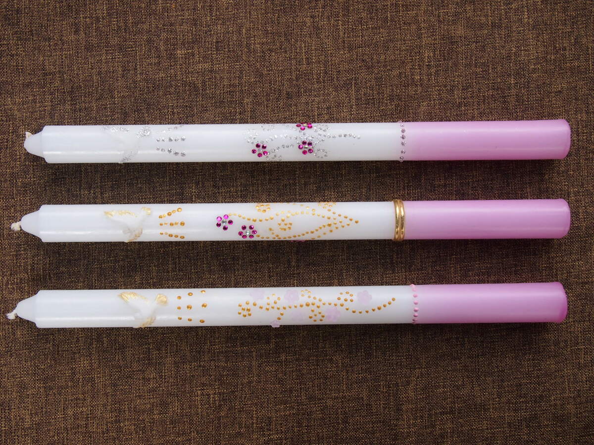 Každá svíce je originální. Svíce jsou ručně zdobené plastickými voskovými (reliefními) prvky, malováním a třpytivými kamínky.