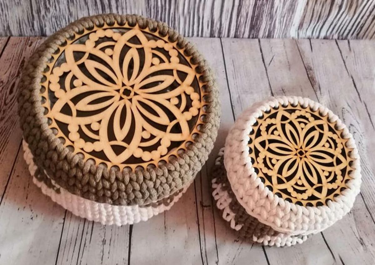 Kulaté výřezy na háčkované košíky s průměrem 17 cm.