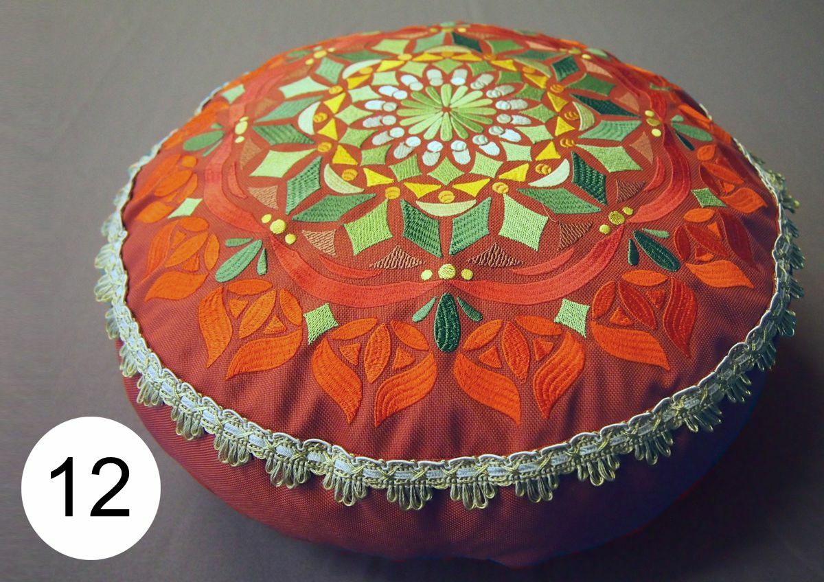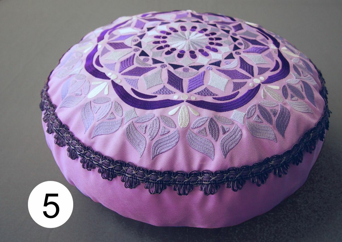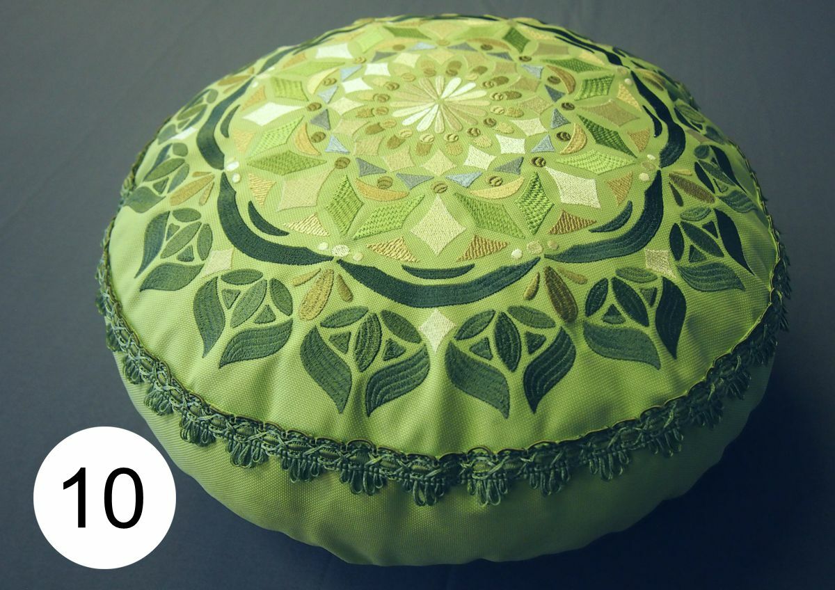 Polštářky pro ideální sezení na zemi (uvnitř i venku), ovšem všechny zazáří i v interiéru. Jsou ušity z velmi pevné polyesterové látky, která má z rubové části zátěr proti vlhkosti a chladu od země. Je třeba chránit před deštěm, horní strana polštářů je prodyšná - barva mechová; pistáciová; skořicová; fialová; světle fialová (lila); černá.