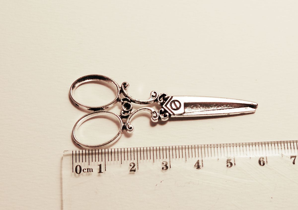Materiál - měkká bižuterní slitina, starostříbrná galvanizace. Nůžky nejsou funkční, jsou oboustranné. (Spodní strana je plochá).