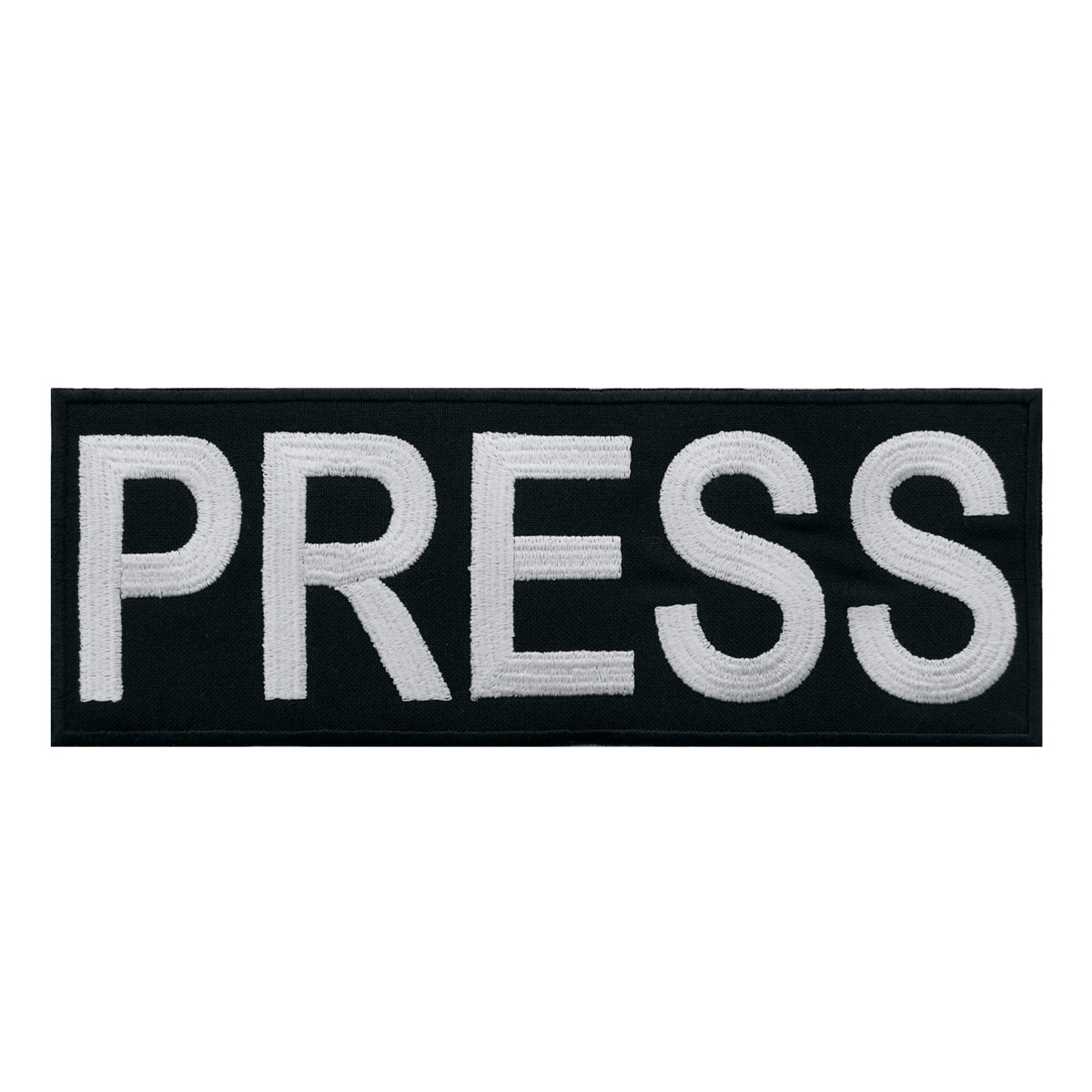 Vyšívaná nášivka na černém podkladu, bílý vyšitý nápis "PRESS"