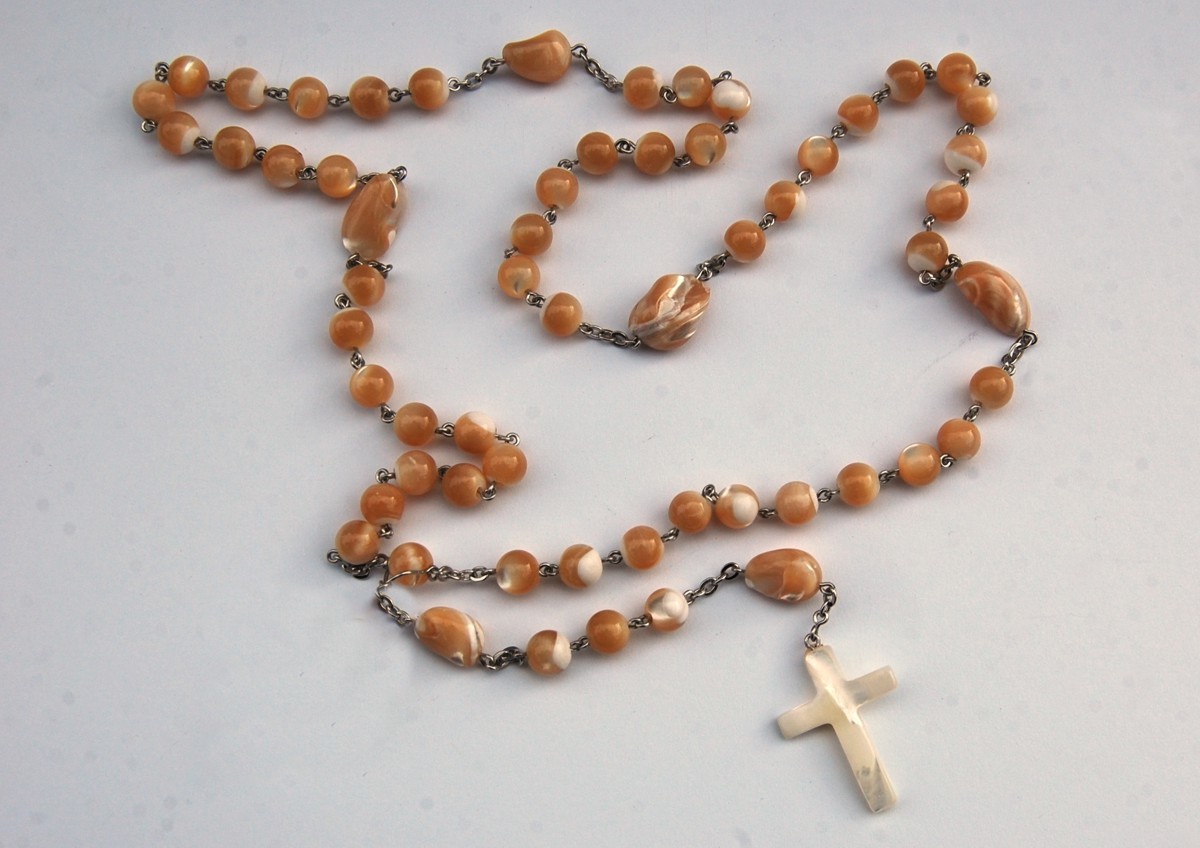 Růženec z přírodního materiálu - béžové perleti. Růženec je uketlován z valounků cca 10 mm a kuliček velikosti 6mm