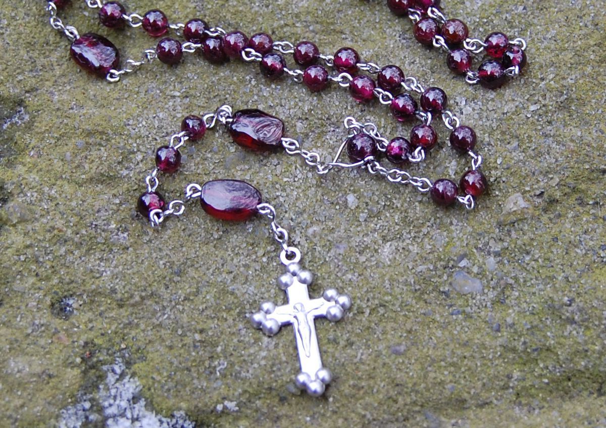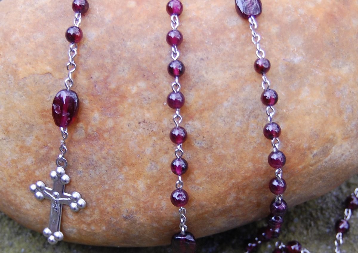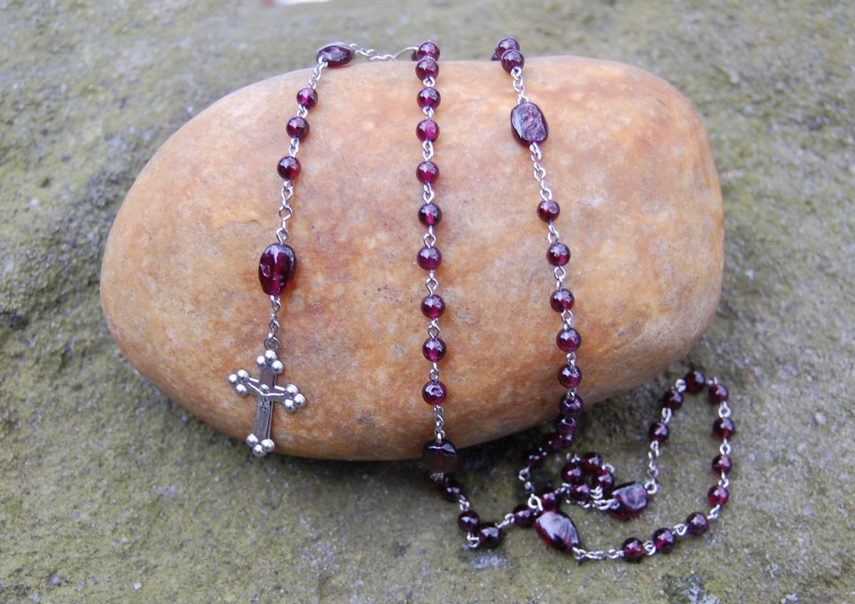 Růženec z granátu a chirurgické oceli vyrobený v naší chráněné dílně.