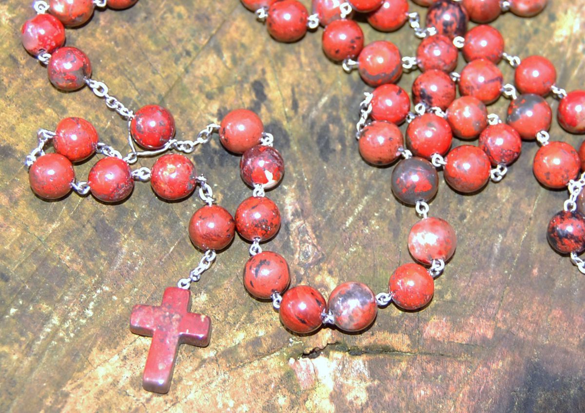 Růženec z červeného brekciového jaspisu a chirurgické oceli vyrobený v naší chráněné dílně.