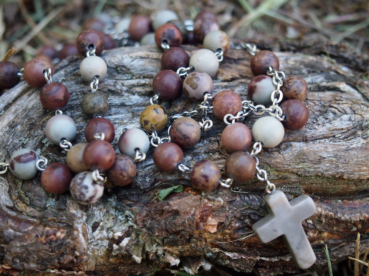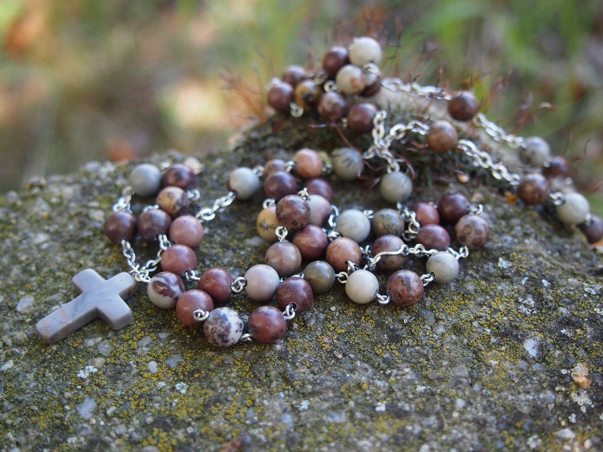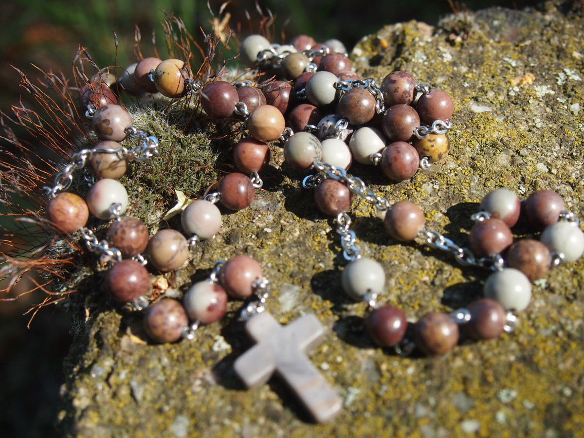 Růženec z nádherného hnědo-šedého jaspisu a chirurgické oceli vyrobený v naší chráněné dílně.