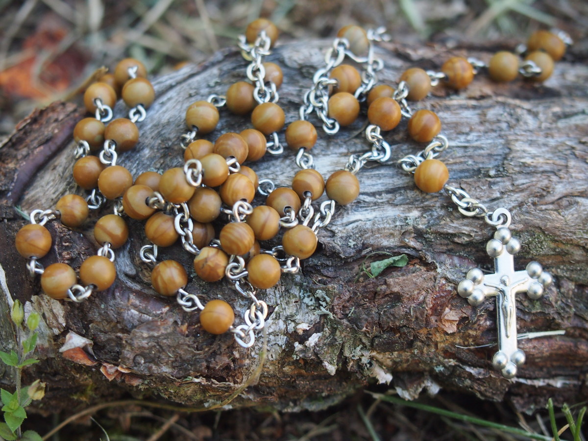 Růženec z krajkového kamene a chirurgické oceli vyrobený v naší chráněné dílně.
