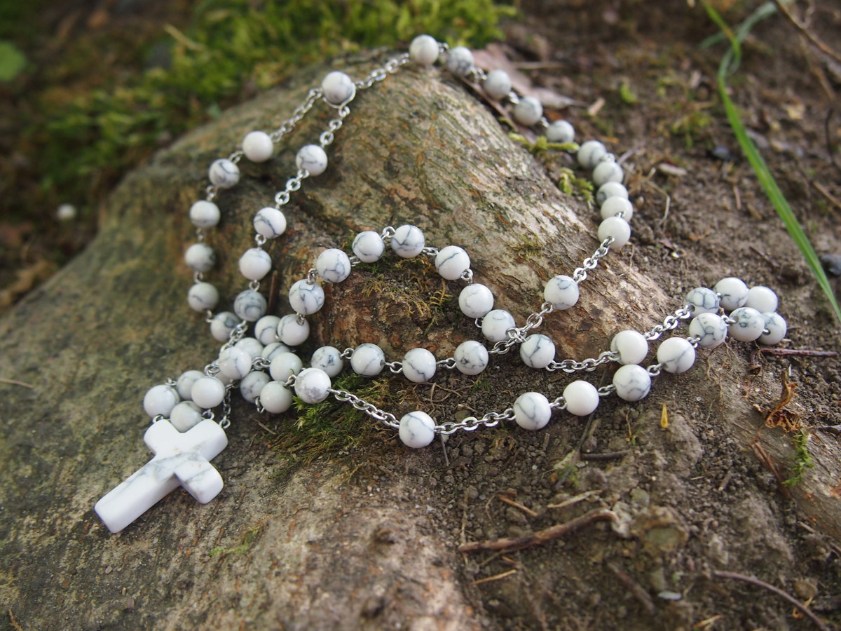 Růženec z magnezitu a chirurgické oceli vyrobený v naší chráněné dílně.