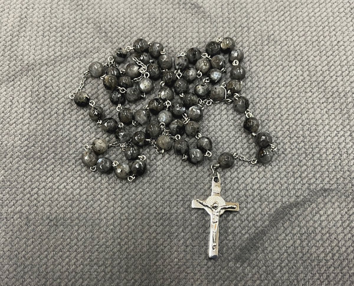 Růženec z norského labradoritu a chirurgické oceli vyrobený v naší chráněné dílně.