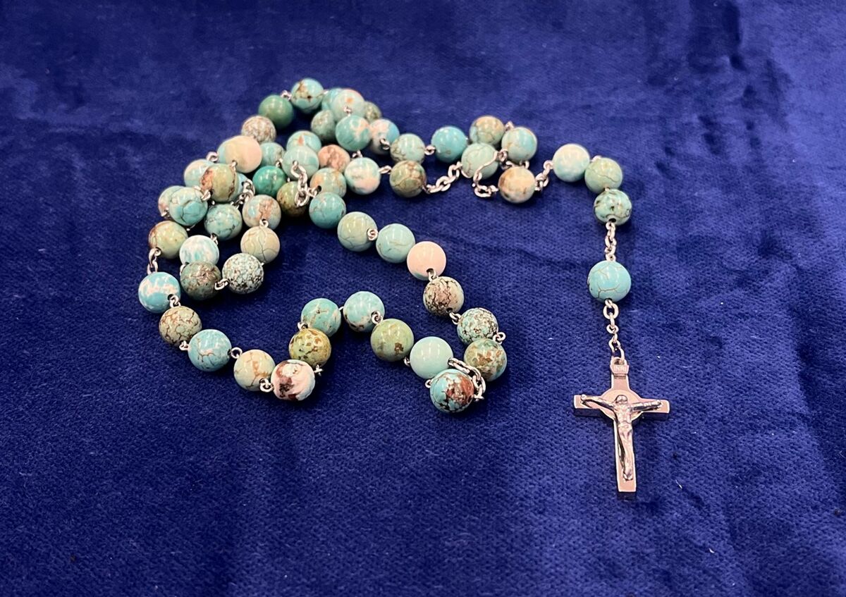 Růženec z rekonstruovaného tyrkysu a chirurgické oceli vyrobený v naší chráněné dílně.