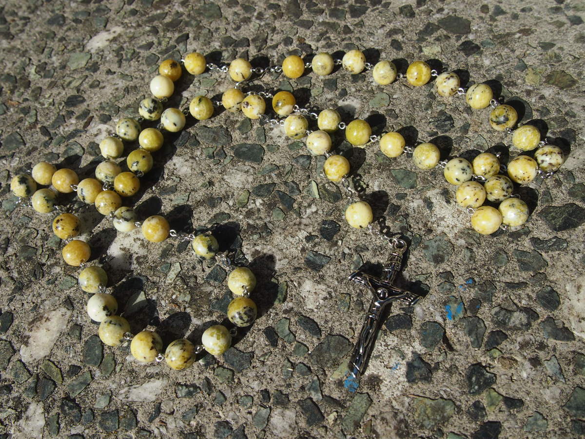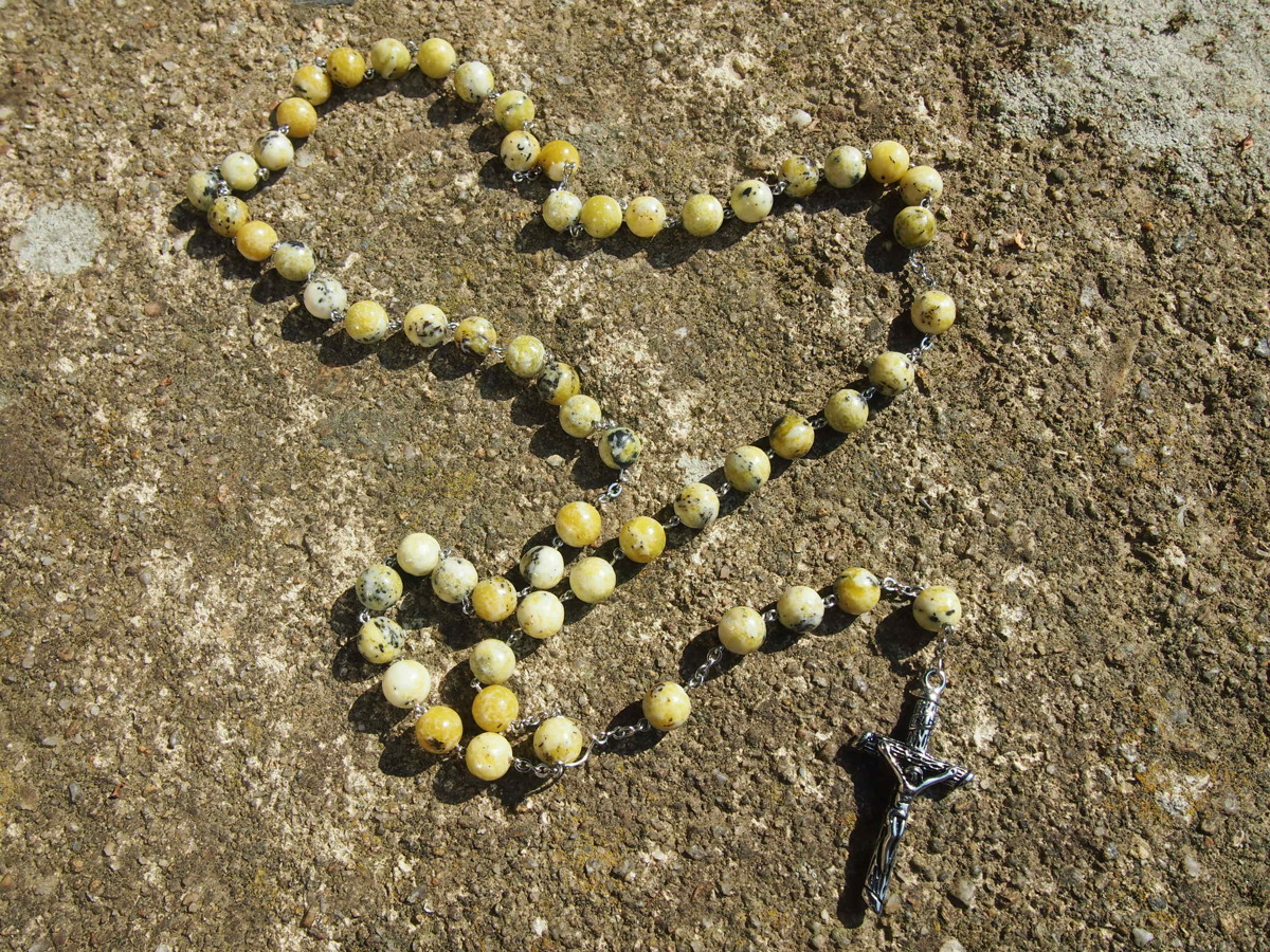 růženec je masivní, je na něm dobře vidět kresba a struktura kamene. Jde nosit na krku, obvod růžence je cca 65 cm (lze snadno přetáhnout přes hlavu). Průměr korálků je 8 mm. Tato varianta je vhodná i pro člověka s horší citlivostí v prstech.