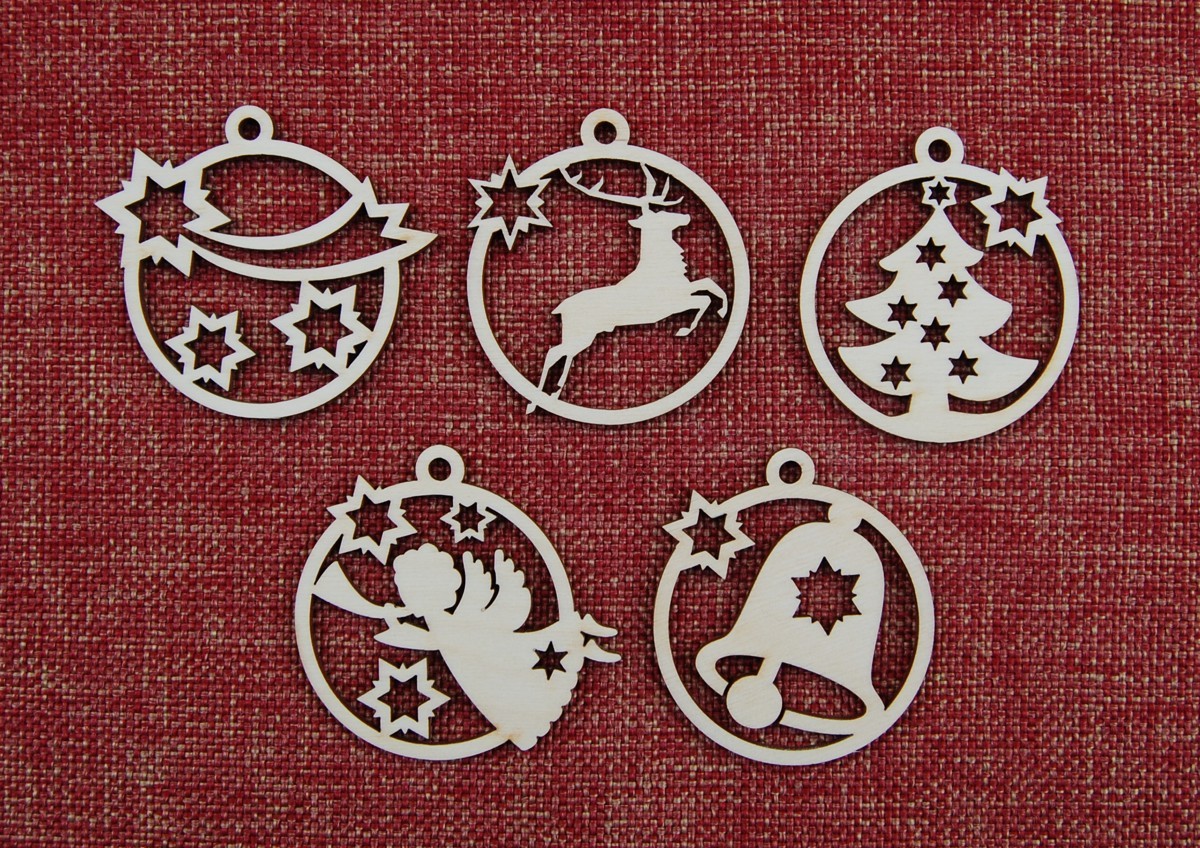 Sada ozdob z překližky, 5 ks v balení. Je možné vybrat buď balení pěti stejných ozdob nebo mix, kde je zastoupený každý druh po jedné.