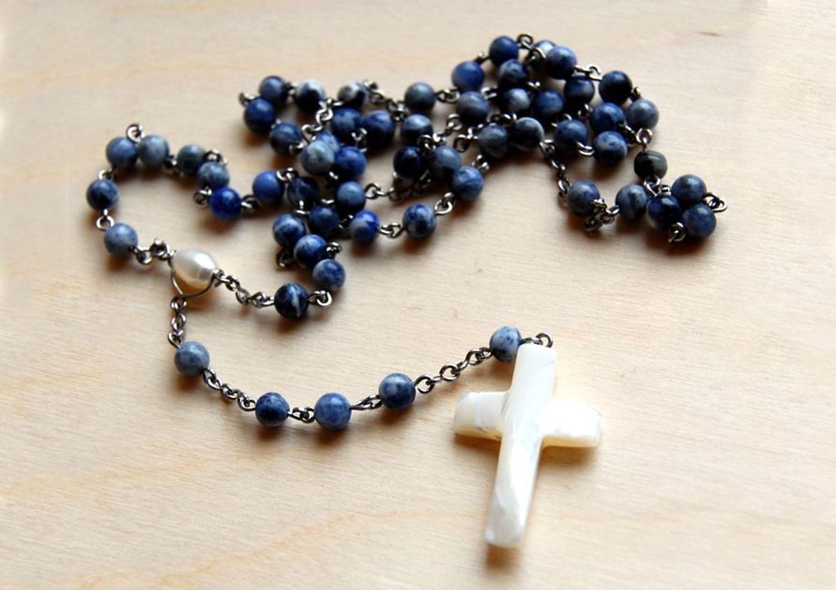 Růženec ze sodalitu a chirurgické oceli vyrobený v naší chráněné dílně.