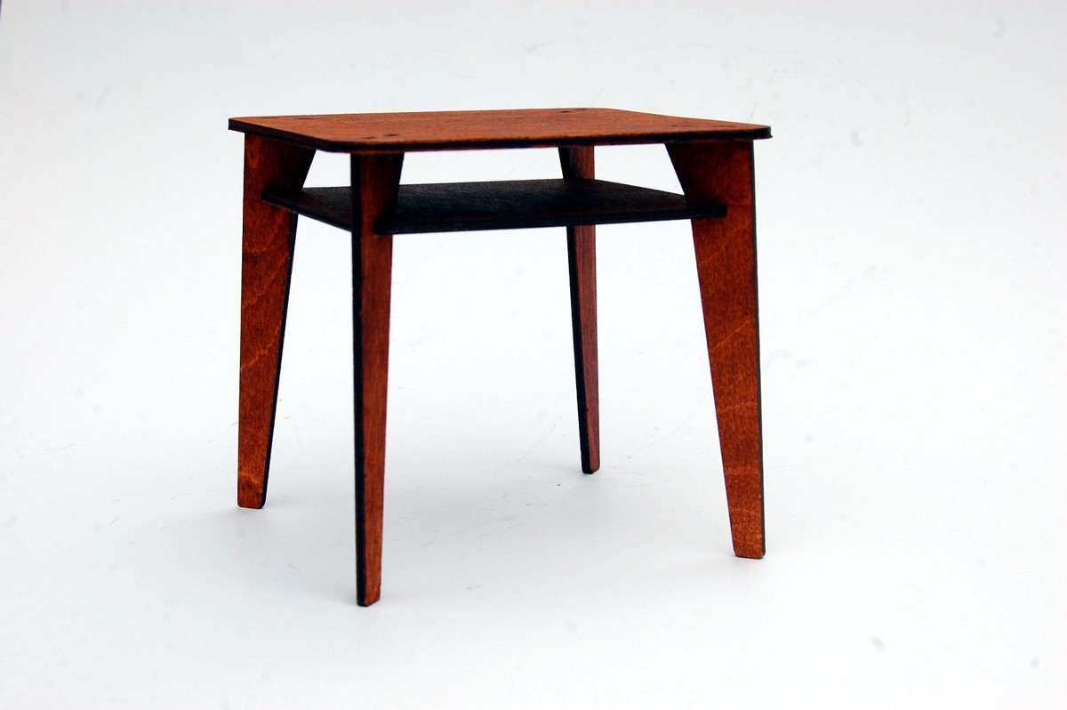 Čtvercový, kruhový, nebo obdélníkový kuchyňský stůl s dvojitou deskou a úložným prostorem na knihu. Je vyrobený z bukové překližky. Neobsahuje kovové části. Barevné varianty jsou dodávány již sestavené a zajištěné lepidlem. Varianta přírodní je dodávána jako stavebnice v rozloženém stavu.