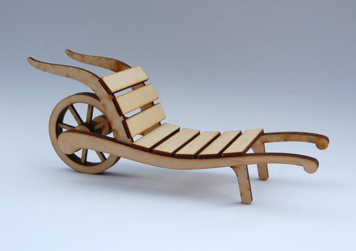 Trakař je laserem vyřezaný z bukové překližky, celodřevěný, bez kovových částí.