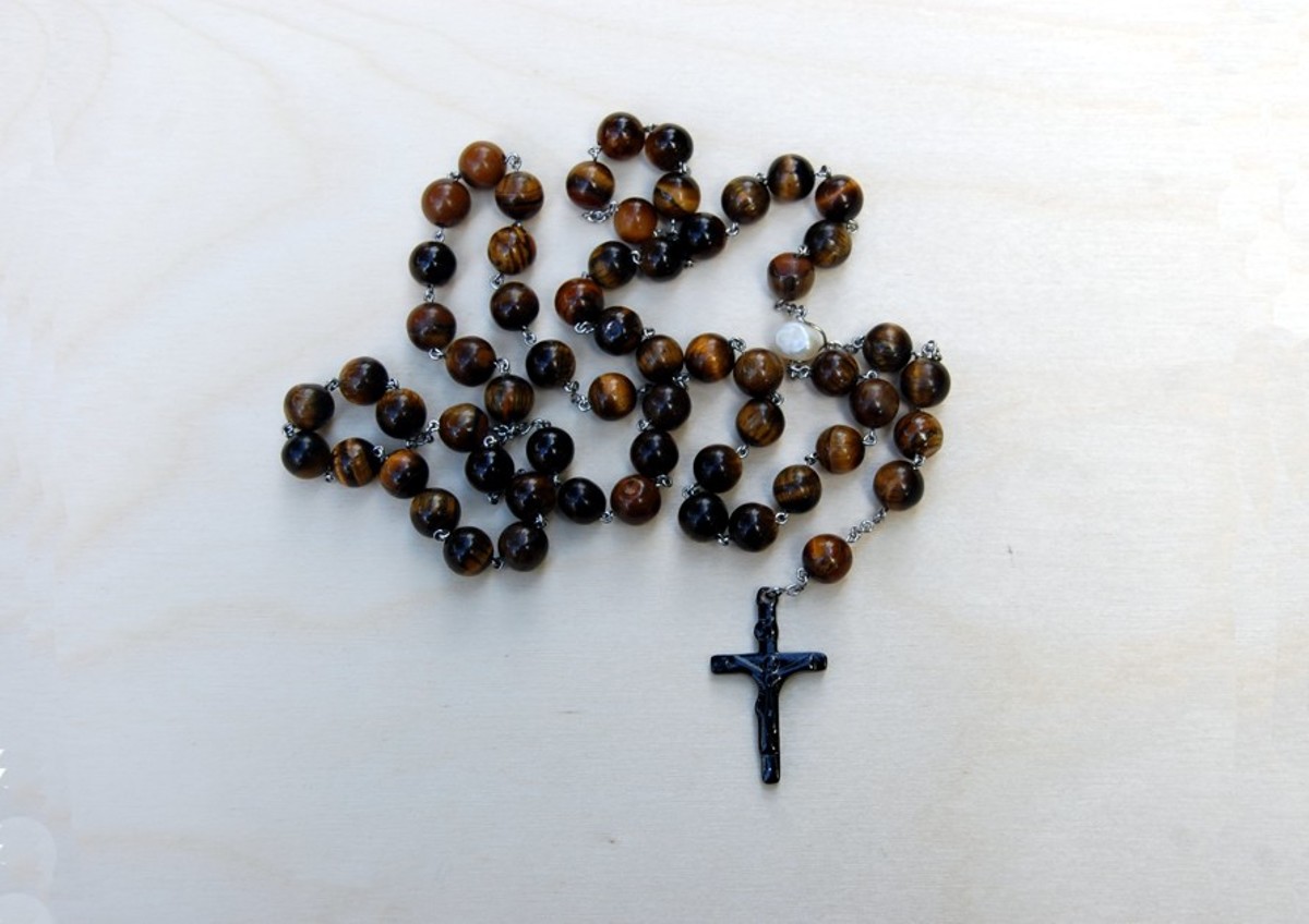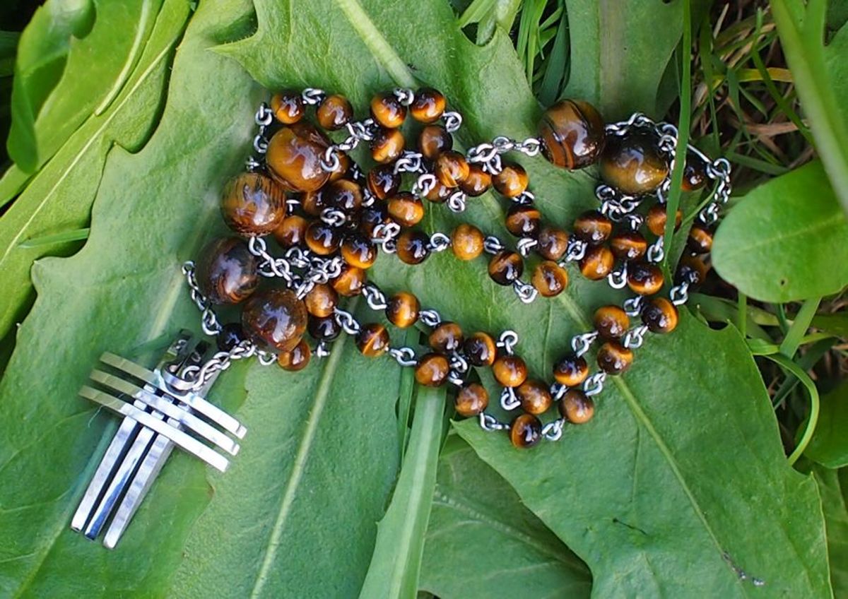 Růženec z kamene tygří oko a chirurgické oceli vyrobený v naší chráněné dílně.