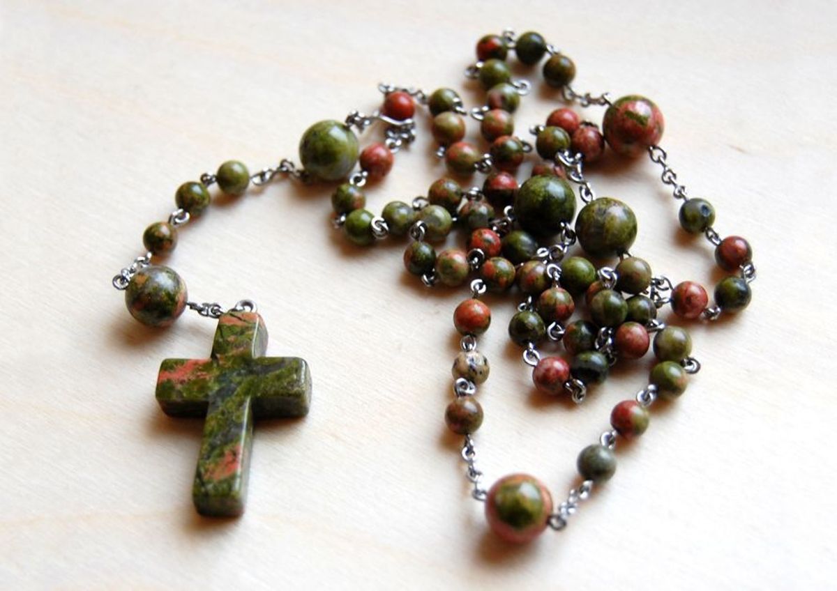 Růženec z unakitu a chirurgické oceli vyrobený v naší chráněné dílně.