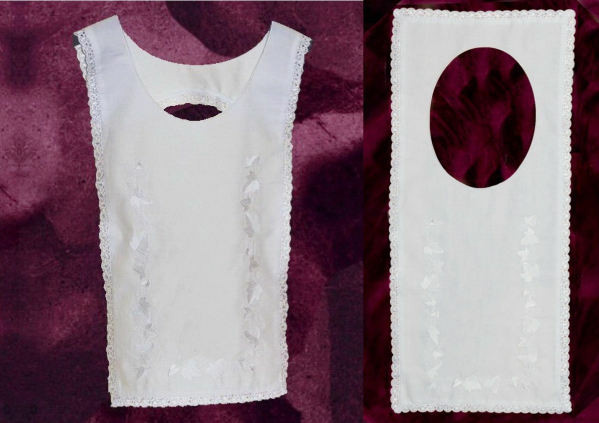 Křestní rouško symbolizuje bílý oděv, který obléká křtěnec na znamení čistoty a nového života. Používá se při křtu a zůstává křtěnci na památku. Rouška z naší dílny jsou vyšívaná bílou lesklou viskózovou přízí na bílém bavlněném plátýnku a lemovaná krajkou madeirou 1,5 cm širokou. Lesklá bílá příze je na plátně dobře vidět a působí čistým a důstojným dojmem. Symbolika čistě bílého roucha zůstává zachována.